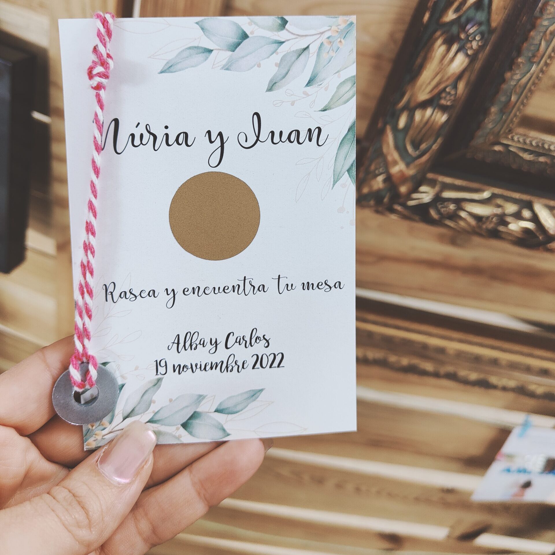 Qué te parece que tus invitados busquen su mesa de una manera más divertida. Colgando tarjetas individuales o por parejas con el número de mesa oculto y que se descubrirá con un rasca.